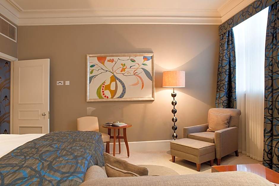 Elegant open-plan suite with a living/dining area, a flat-screen TV. The bathroom has a separate bath and shower.